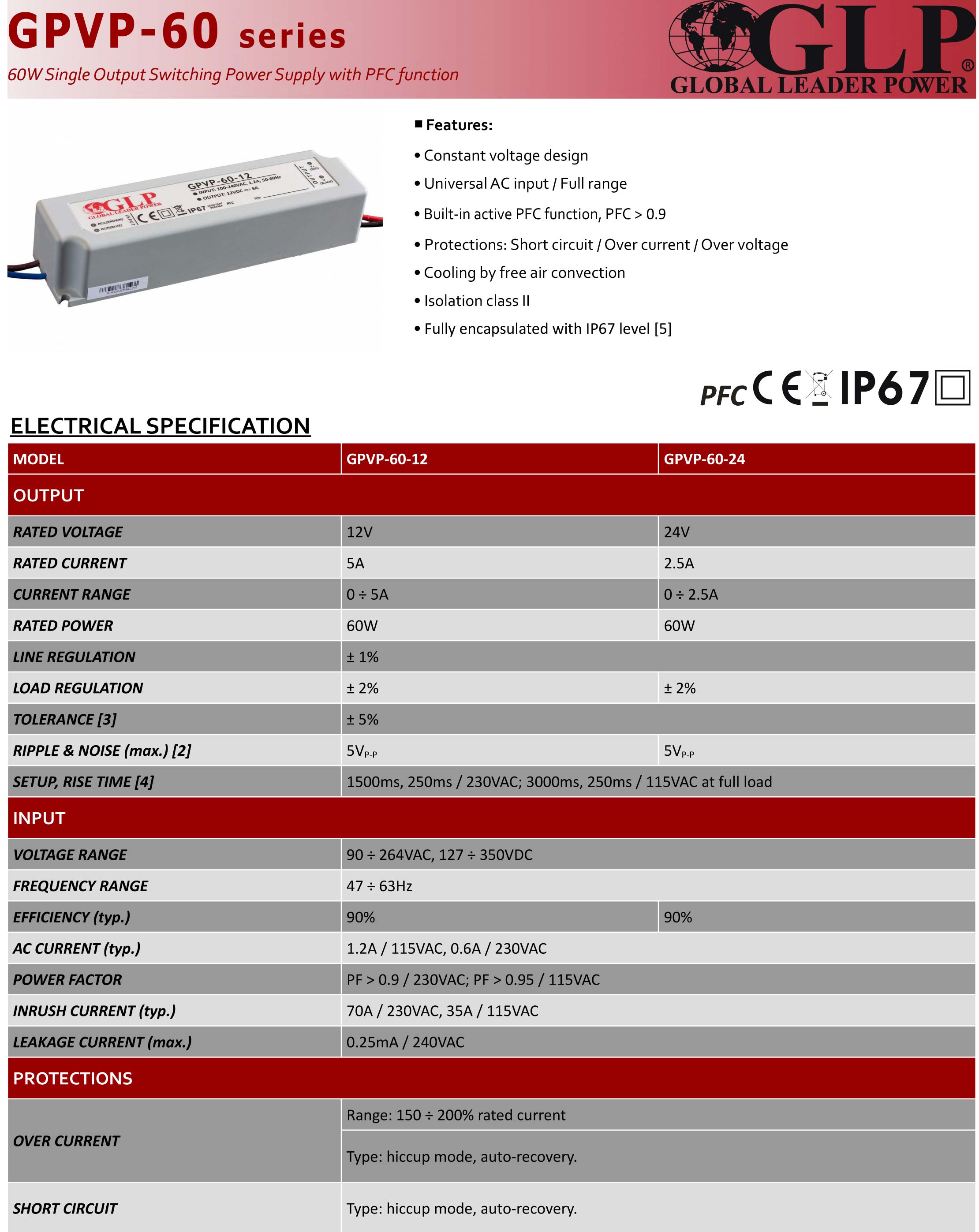 Αδιάβροχο 60W Πλαστικό Τροφοδοτικό 12V IP67 GPVP-60 GLP