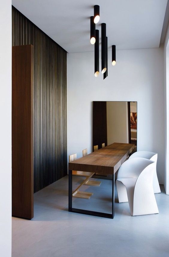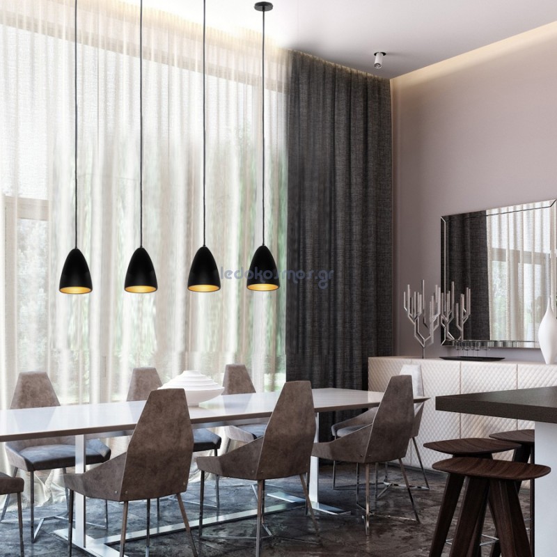 Μπορείτε να επιλέξετε ένα φωτιστικό που να ταιριάζει απόλυτα με το στυλ του χώρου σας ή να κάνετε την ανατροπή και να τοποθετήσετε ένα τελείως διαφορετικού ύφους φωτισμό για την τραπεζαρία σας, για παράδειγμα κλασσικός πολυέλαιος με κρύσταλλα σε μίνιμαλ/βιομηχανικό χώρο.