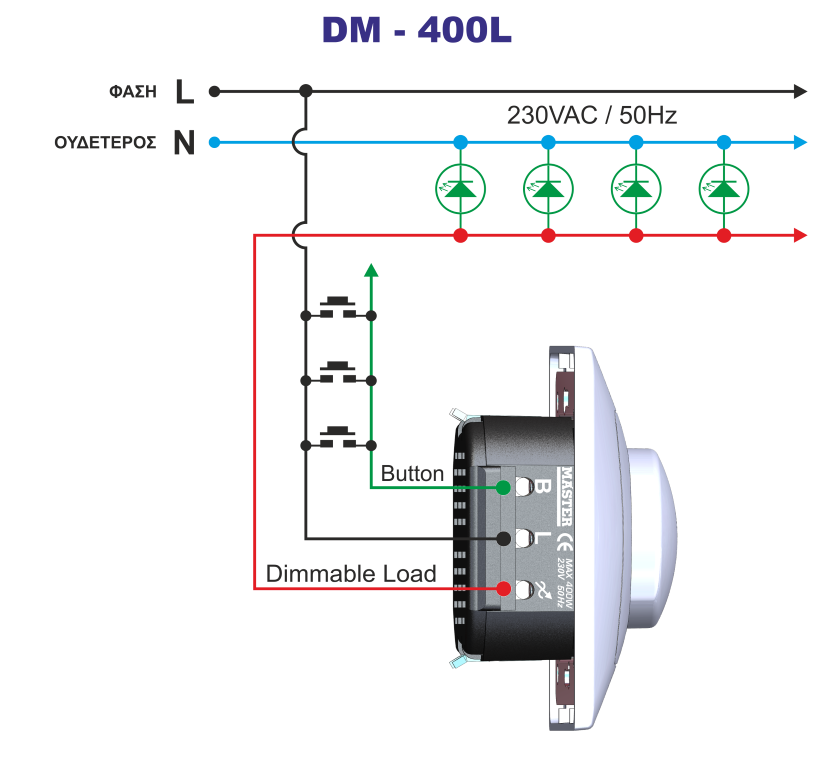 Dimmer Master Τοίχου 230V 400W Κατάλληλο Για LED Χωρίς Ουδέτερο DM-400L/N