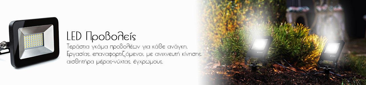 Βρείτε μέσα από τη μεγάλη ποικιλία που διαθέτουμε στο ηλεκτρονικό μας κατάστημα προβολείς led ιδανικούς για εξωτερικούς χώρους. Φροντίστε για την ασφάλεια του σπιτιού σας ή της εξοχικής κατοικίας σας χρησιμοποιώντας led προβολείς που διαθέτουν ανιχνευτή κίνησης ή αισθητήρα μέρας-νύχτας. Ακόμη, μπορείτε να εκμεταλλευτείτε τους έγχρωμους προβολείς led για διακοσμητικούς λόγους όπως π.χ. στον κήπο του σπιτιού σας φωτίζοντας δέντρα και φυτά ή ακόμη και σε σκηνές χώρων ψυχαγωγίας και διασκέδασης. Όλοι οι προβολείς led που προμηθευόμαστε είναι κορυφαίας τεχνολογίας και συνοδεύονται από 2 χρόνια εγγύηση αντικατάστασης. Επισκεφτείτε το κατάστημά μας για να σας βοηθήσουμε να διαλέξετε τον κατάλληλο προβολέα led σύμφωνα με τις ανάγκες του χώρου σας.