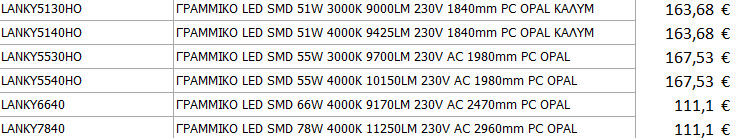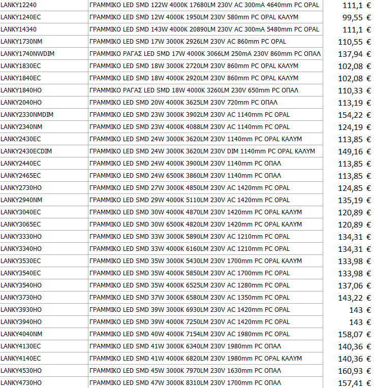 Παρακαλούμε επιλέξτε από τον παρακάτω πίνακα τα διαθέσιμα μοντέλα για τη σειρά Γραμμικών Φωτιστικών Neri Economy. Μπορείτε να επιλέξετε με βάση το μήκος ,τη κατανάλωση σε watt καθώς επίσης και την απόδοση σε Lumen ανάλογα το χρώμα φωτισμού που επιθυμείτε.