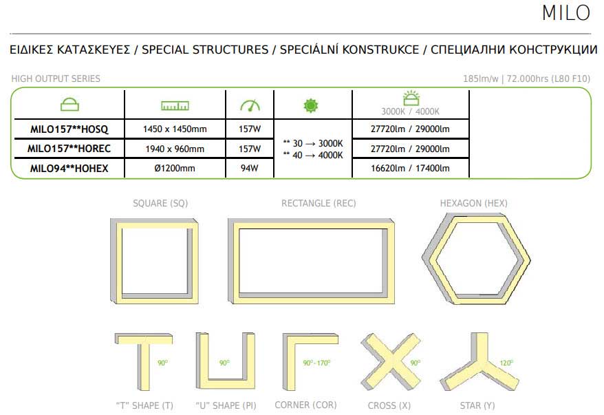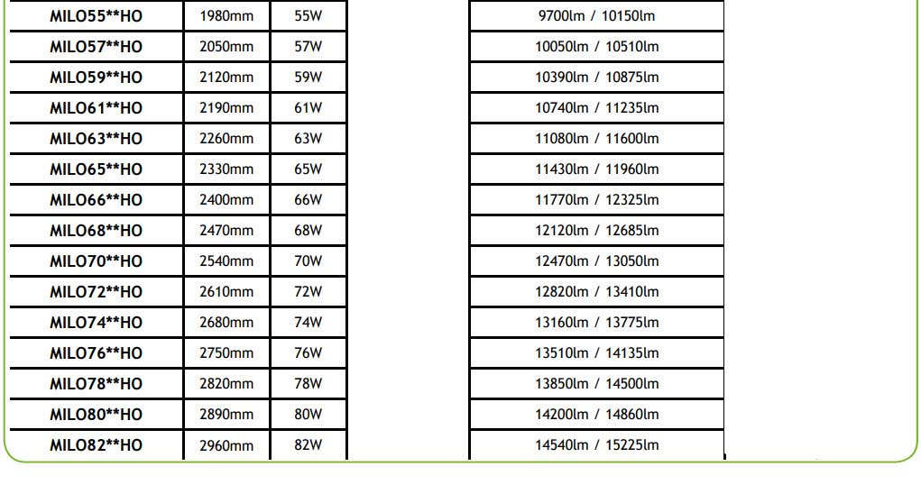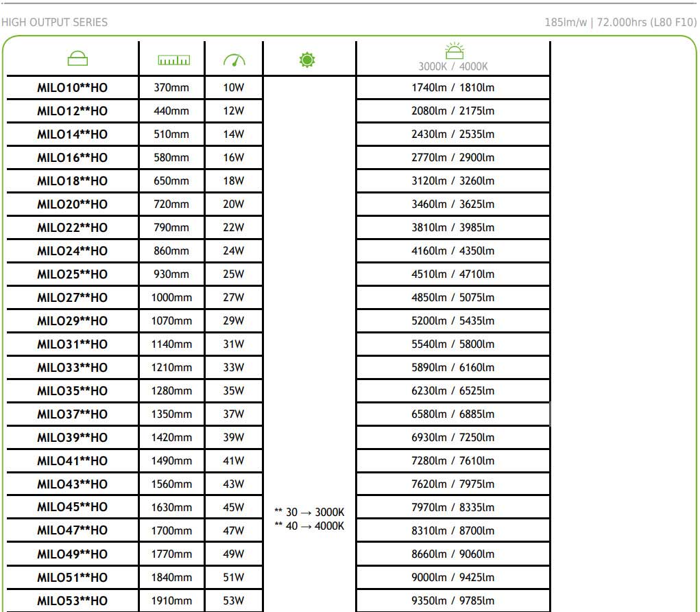Παρακαλούμε επιλέξτε από τον παρακάτω πίνακα τα διαθέσιμα μοντέλα για τη σειρά Γραμμικών Φωτιστικών Milo. Μπορείτε να επιλέξετε με βάση το μήκος ,τη κατανάλωση σε watt καθώς επίσης και την απόδοση σε Lumen ανάλογα το χρώμα φωτισμού που επιθυμείτε.
