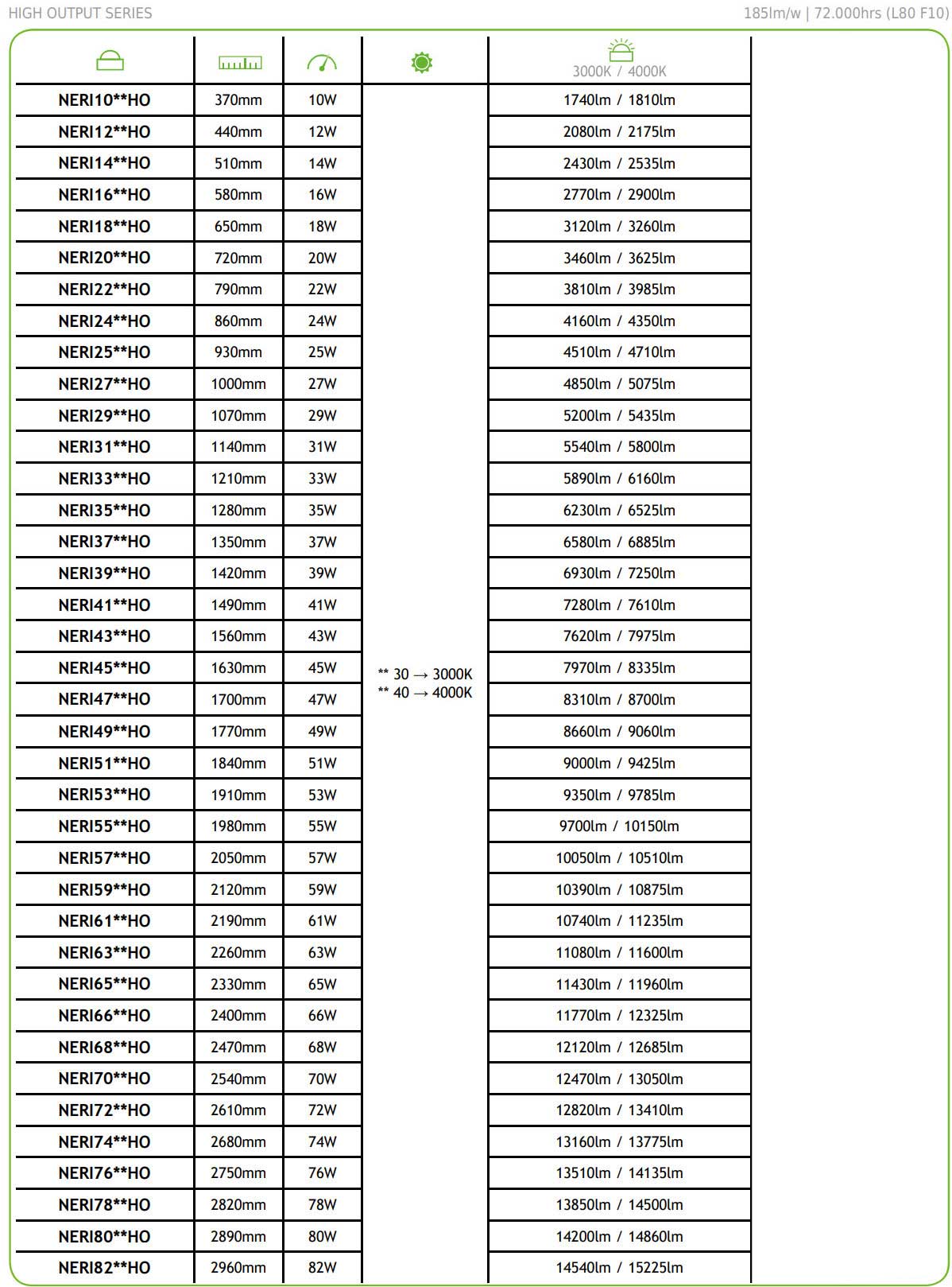 Παρακαλούμε επιλέξτε από τον παρακάτω πίνακα τα διαθέσιμα μοντέλα για τη σειρά Γραμμικών Φωτιστικών Neri Economy. Μπορείτε να επιλέξετε με βάση το μήκος ,τη κατανάλωση σε watt καθώς επίσης και την απόδοση σε Lumen ανάλογα το χρώμα φωτισμού που επιθυμείτε.