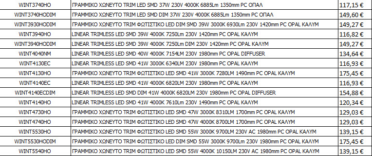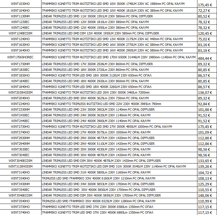 Παρακαλούμε επιλέξτε προσεκτικά από τον παρακάτω πίνακα τα διαθέσιμα μοντέλα για τη σειρά Γραμμικών Φωτιστικών WINT.