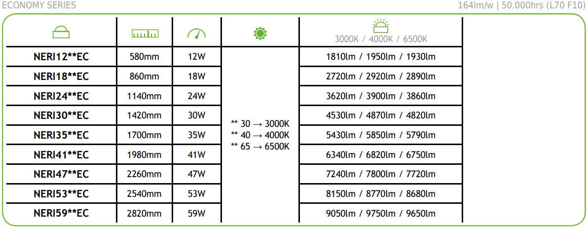 Παρακαλούμε επιλέξτε από τον παρακάτω πίνακα τα διαθέσιμα μοντέλα για τη σειρά Γραμμικών Φωτιστικών Neri Economy. Μπορείτε να επιλέξετε με βάση το μήκος ,τη κατανάλωση σε watt καθώς επίσης και την απόδοση σε Lumen ανάλογα το χρώμα φωτισμού που επιθυμείτε.